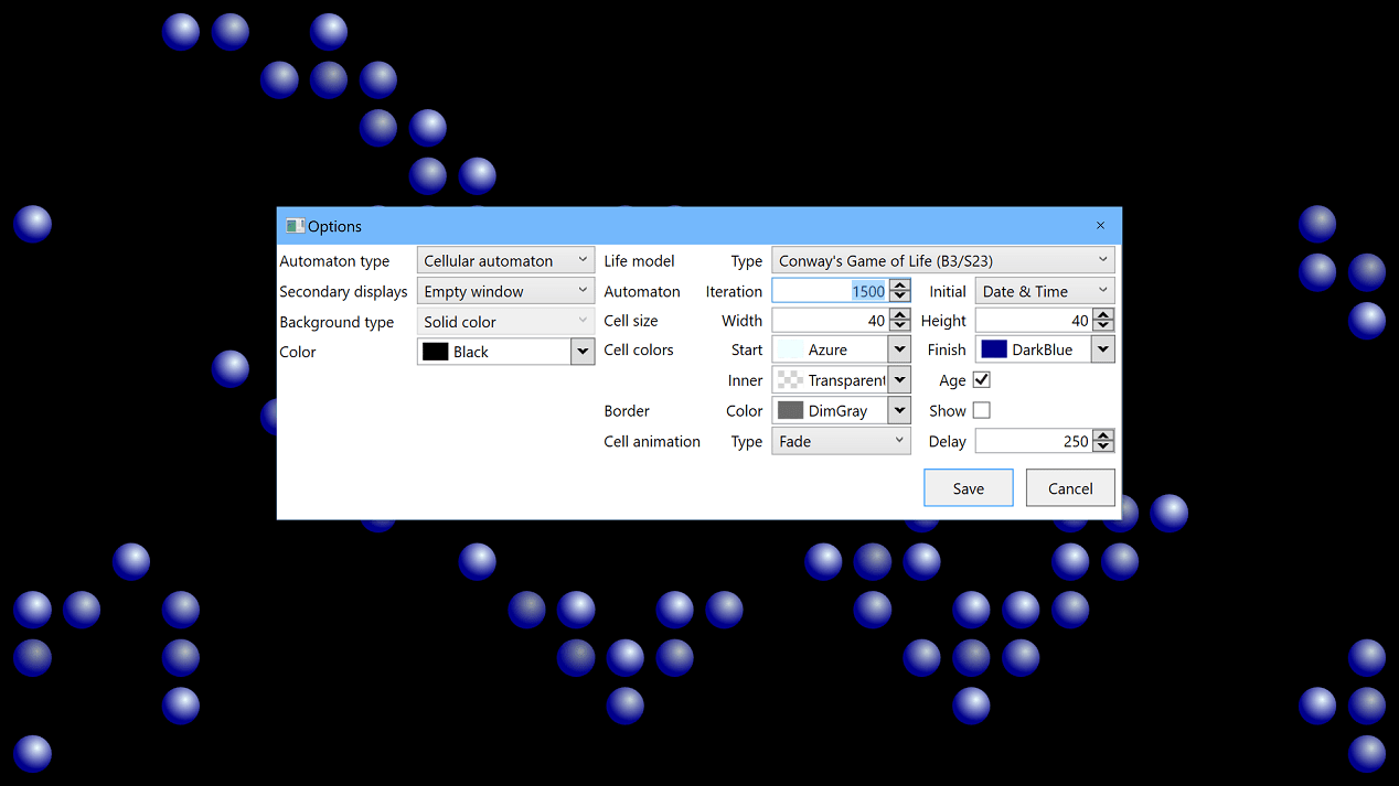 Settings contains life algorithm, colors, cell sizes. Let us consider it in details.