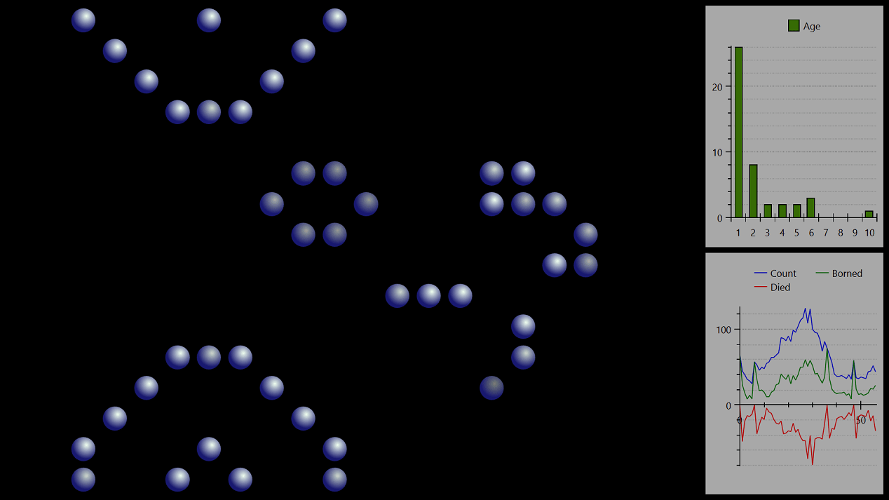 Statistics is presented by two float semi-transparent windows in the left part of screen. Each automaton window has its own statistics window. The application uses OxyPlot library for chart controls, as it is lightweight and easy to use. The top statistics window shows column chart with distribution of cells per their age. There exist life algorithms such that cells could live many iterations, and chart summarizes count of all cells with age more than 50.