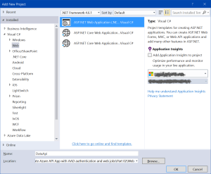Create Azure API App with AAD authentication and web jobs – Data API app without authentication
